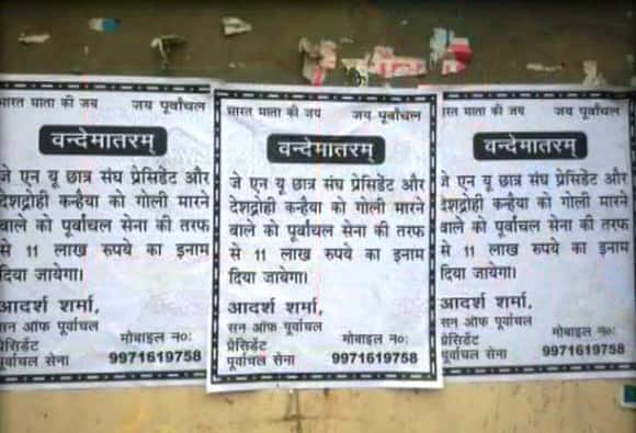 जेएनयू विद्यार्थी परिषदेचा अध्यक्ष कन्हैया कुमारला गोळी मारेल, त्याला 11 लाख रुपयांचं इनाम दिलं जाईल, असे पोस्टर पूर्वांचल सेना नावाच्या एका संघटनेने दिल्लीत ठिकठिकाणी लावले होते. या पोस्टरवर आदर्श शर्माचं नाव आणि मोबाईल नंबर लिहिला होता. या पोस्टरनंतर त्याच्याविरोधात पोलिसात तक्रार दाखल करण्यात आली होती.
