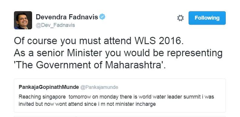 सिंगापूरला वर्ल्ड वॉटर लीडर समिटसाठी पोहोचलेल्या पंकजांनी आता मी जलसंधारण खात्याची मंत्री नसल्याने या परिषदेला उपस्थित राहणार नसल्याचं ट्वीट केलं. त्यावर खात्याची मंत्री म्हणून नव्हे तर सरकारची प्रतिनिधी म्हणून या परिषदेला हजर राहा, असं ट्वीट मुख्यमंत्री देवेंद्र फडणवीसांनी केलं.